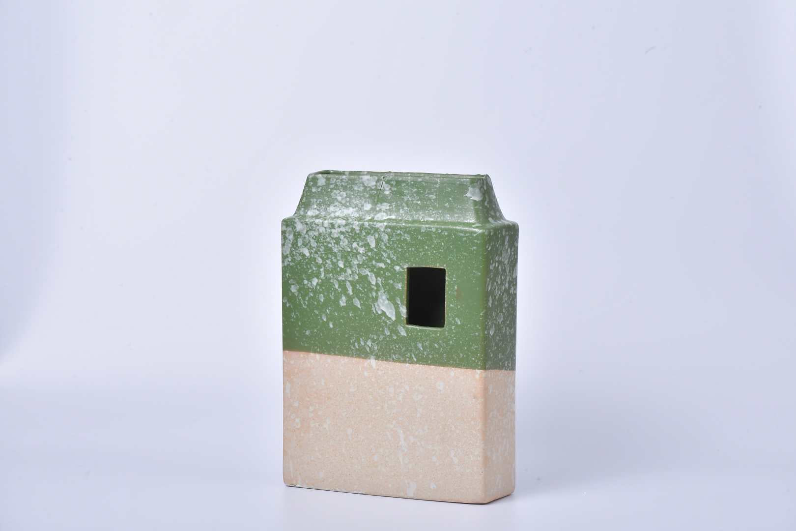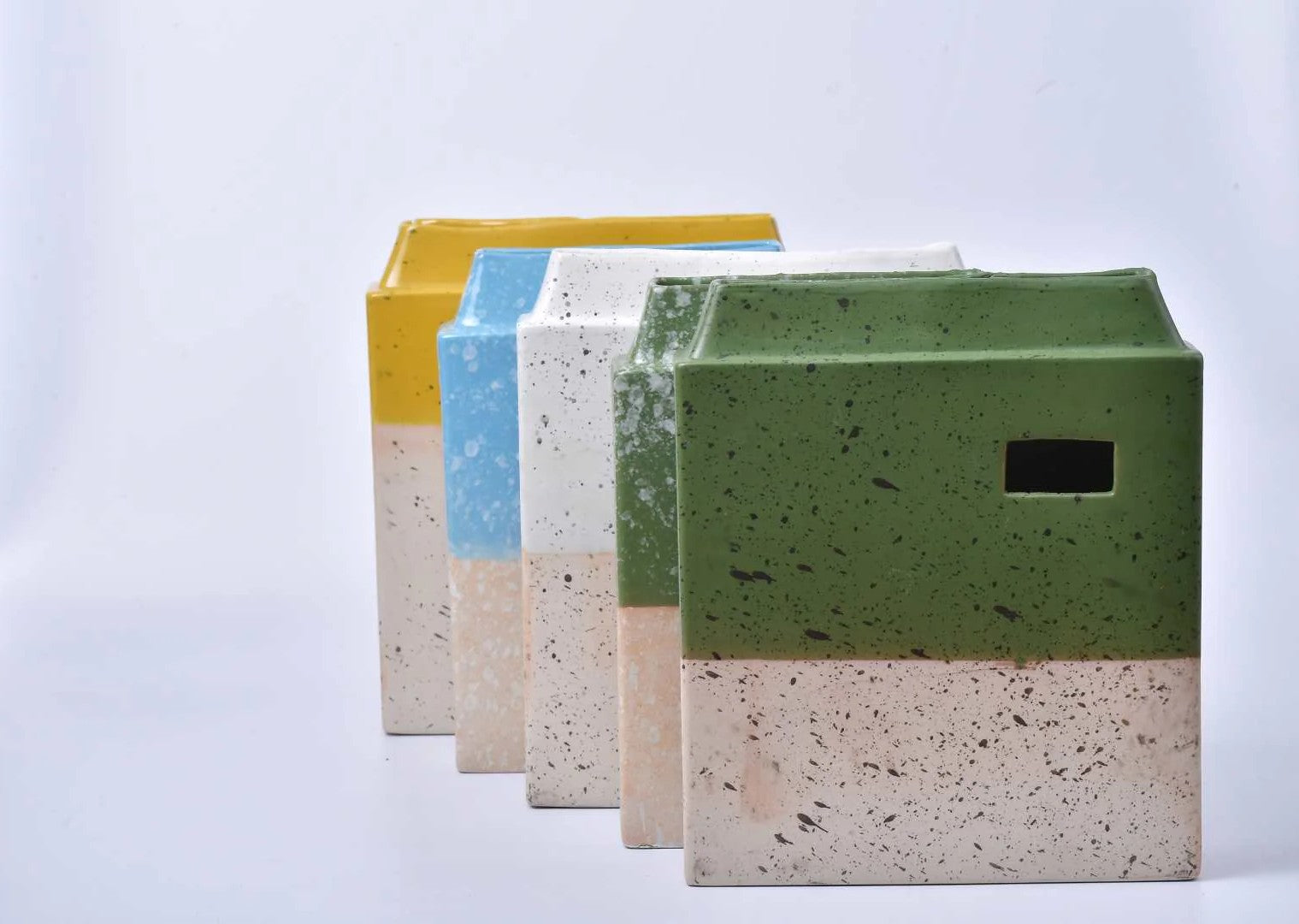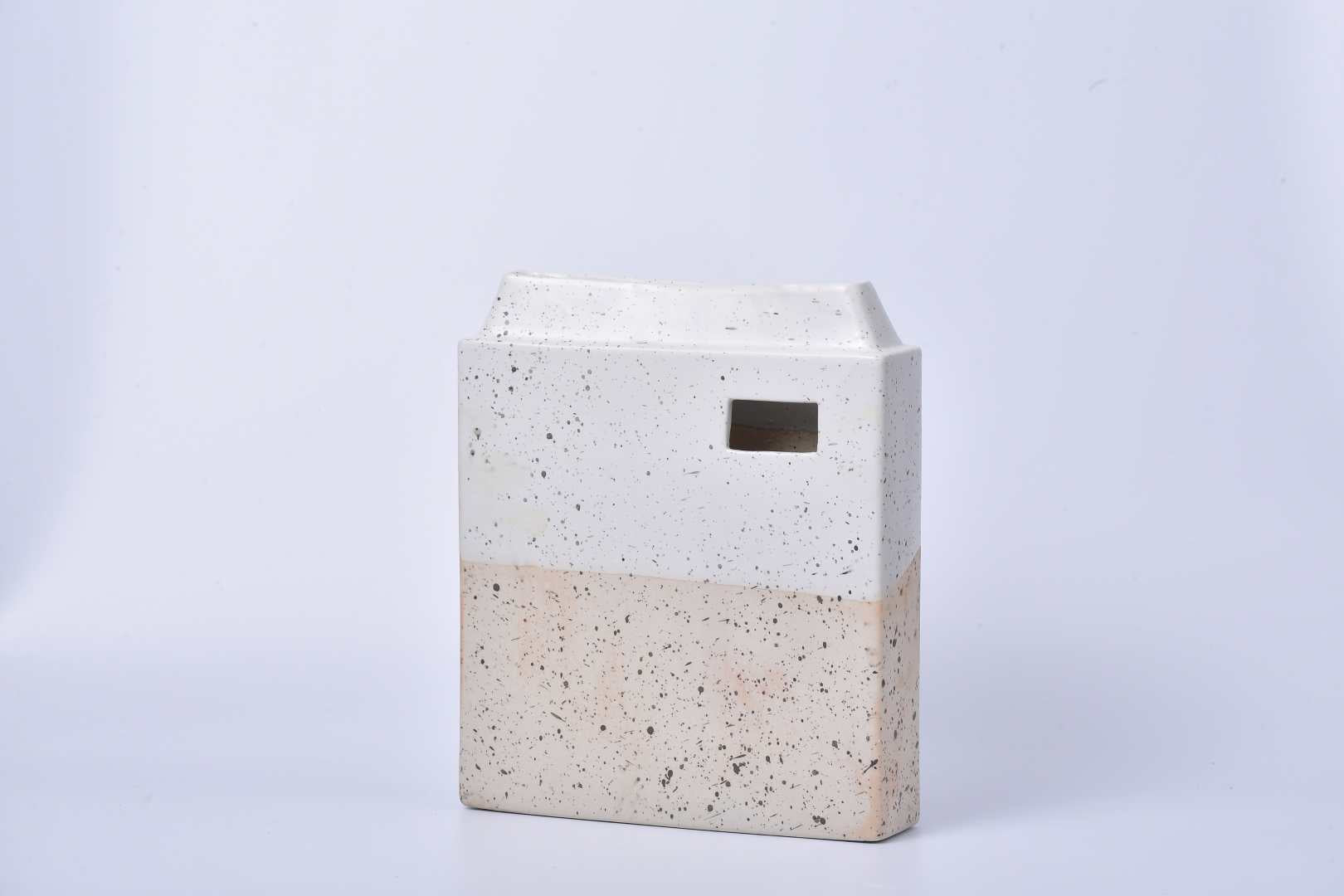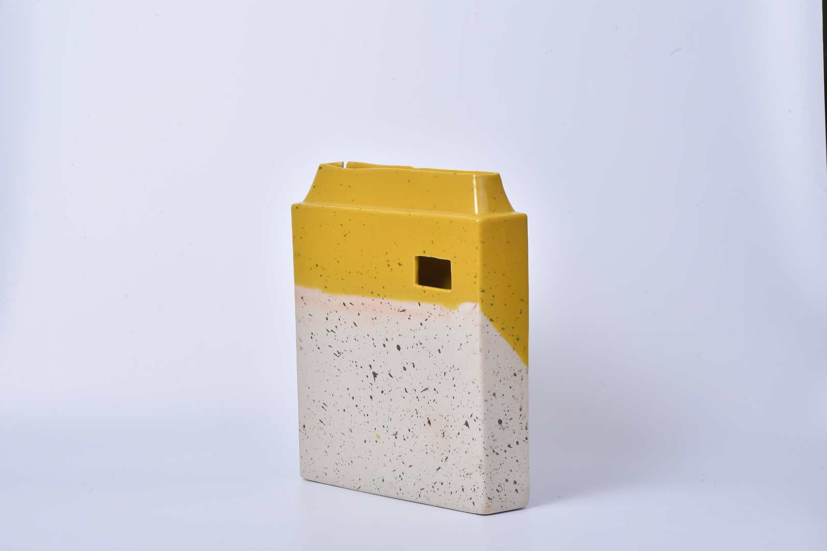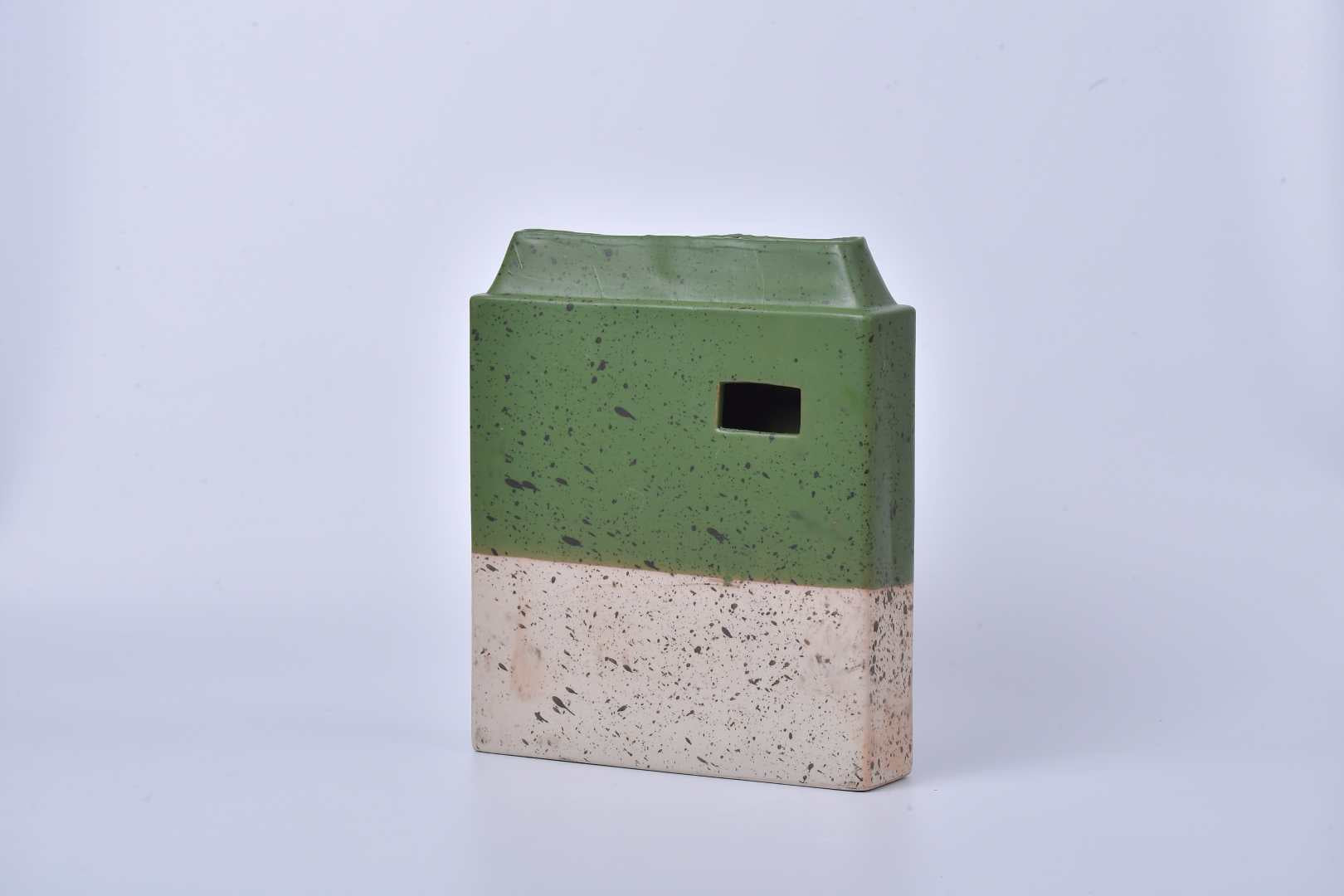 Rectangular design vase with two flower insertion points: an opening on top and a front opening. It is available in 5 colors